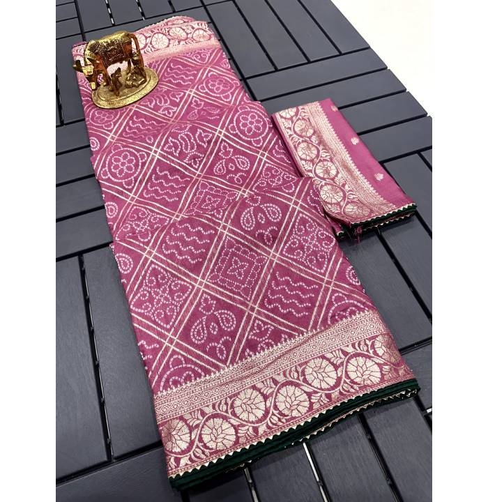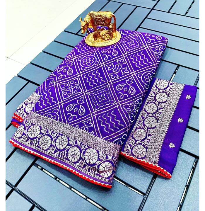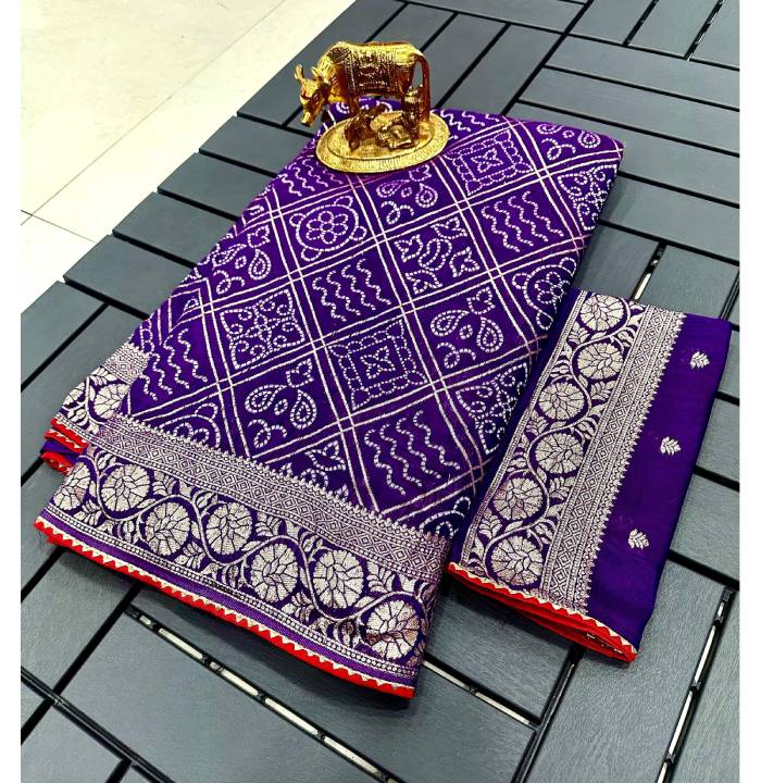 Luxury Pure Kolkata Viscose Saree with Exquisite Ajrakh, Bandhani, Ghatchola, and Zari Weaving